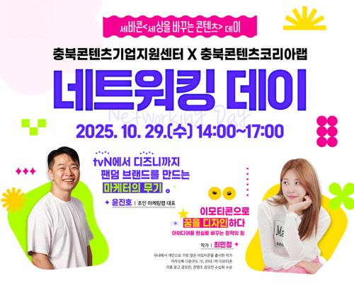2025 충북콘텐츠기업지원센터X충북콘텐츠코리아랩 네트워킹 데이 [세상을 바꾸는 콘텐츠 “세바콘 데이”] 참여자 모집 - 행사명: 세상을 바꾸는 콘텐츠 데이 충북콘텐츠기업지원센터 X 충북콘텐츠코리아랩 네트워킹 데이 - 일시: 2025년 10월 29일 (수), 14:00 ~ 17:00 - 장소: 충북콘텐츠기업지원센터 2층 세미나실 충북 청주시 청원구 밀레니엄4로 48-17 (오동동 770, 충북콘텐츠기업지원센터) ※행사 시작 5분 전까지 참석 부탁드립니다. 1. 콘텐츠 분야 연사 강연 - 시간 : 14:20~15:10(50분) - 연사자 : 윤진호(초인 마케팅랩 대표 디렉터) - 주제: tvN에서 디즈니까지 팬덤 브랜드를 만드는 마케터의 무기 - 시간 : 15:20~16:10(50분) - 연사자 : 최민정(국내 최다 이모티콘 출시 작가) - 주제: 이모티콘으로 꿈을 디자인하다 - 부제 : 아이디어를 현실로 바꾸는 창작의 힘 2. 교류의 시간 - 사업홍보 - 전문가 상담 **14시부터 진행 - 센터 시설관람 - 참가자 자율 네트워킹 등 ⊙주최/주관 : 충청북도 / 충북과학기술혁신원 / 청주시문화산업진흥재단 ⊙ 신청방법 : 구글폼 작성(https://forms.gle/MaxnxHRfdeQgdENg9) ⊙신청기간 : 2025. 10. 01.(수) ~ 2025. 10. 24.(금) ※ 선착순 50명 한정 -메일 : hornin16@ideapartners.co.kr -전화: 070-4254-1441 - 관련내용: https://www.cbist.or.kr/home/sub.do?mncd=1131&mode=view&no=61866114