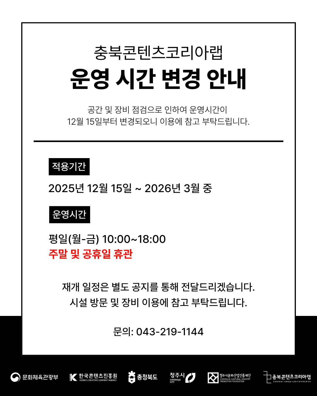공간 및 장비 점검으로 인하여 운영시간이 12월 15일부터 변경되오니 이용에 참고 부탁드립니다. 📌 적용기간: 2025년 12월 15일 ~ 2026년 3월 중 📌 운영시간: 평일(월-금) 10:00~18:00, 주말 및 공휴일 휴관 재개 일정은 별도 공지를 통해 전달드리겠습니다. 시설 방문 및 장비 이용에 참고 부탁드립니다. 문의: 043-219-1144 |