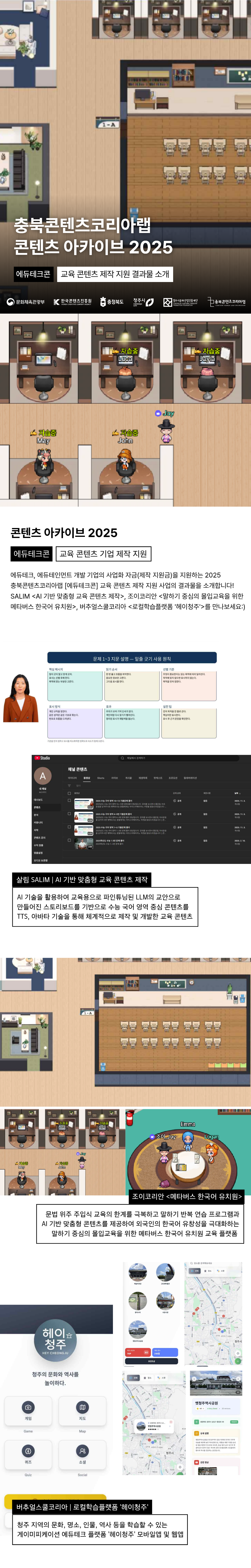 Home CB CKL 소식 CBCKL 소개 CBCKL 소식 프로그램 신청하기 홍보마당 커뮤니티 사이트 정보 로그인 마이페이지 콘텐츠이슈 공지사항 보도자료 콘텐츠이슈 sns 공유하기 페이스북 공유하기 트위터 공유하기 블로그 공유하기 프린트하기 콘텐츠이슈 콘텐츠이슈 상세보기 - 제목, 담당부서, 담당자, 담당연락처, 내용, 첨부파일 정보 제공 제목 2025 [에듀테크콘] 교육 콘텐츠 제작 지원 결과물 소개 새글 핫이슈 사진 확대보기 파일 5. 에듀테크콘.png 목록 이전글 2025 [스토리X콘텐츠] 콘텐츠 창·제작 교육 프로그램 결과물 소개 다음글 2025 [라이징스타콘] 음악 창·제작 교육 프로그램 결과물 소개