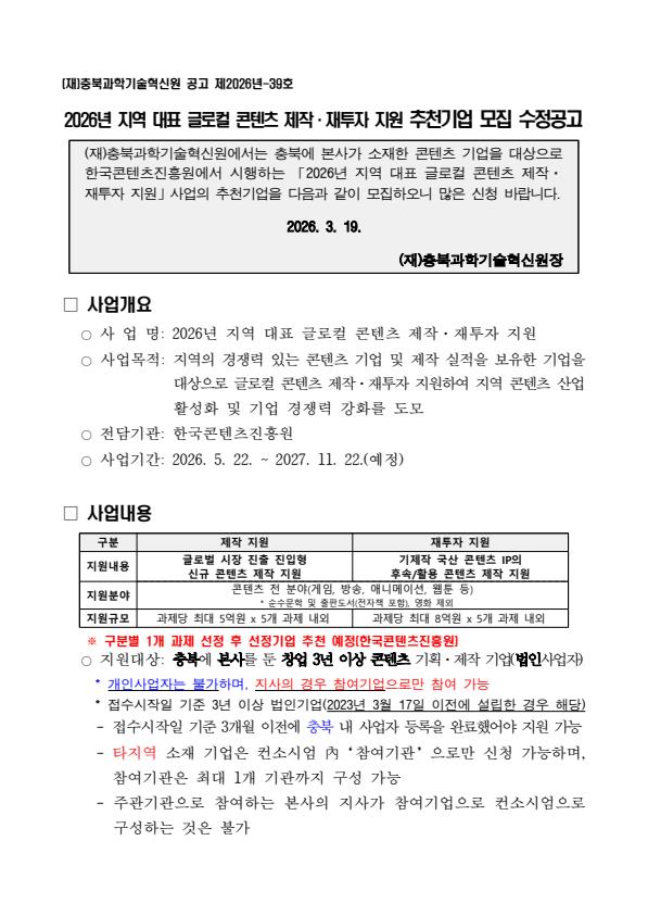 (재)충북과학기술혁신원에서는 충북에 본사가 소재한 콘텐츠 기업을 대상으로 한국콘텐츠진흥원에서 시행하는 「2026년 지역 대표 글로컬 콘텐츠 제작· 재투자 지원」사업의 추천기업을 다음과 같이 모집하오니 많은 신청 바랍니다. □ 사업개요 ○ 사 업 명: 2026년 지역 대표 글로컬 콘텐츠 제작·재투자 지원 ○ 사업목적: 지역의 경쟁력 있는 콘텐츠 기업 및 제작 실적을 보유한 기업을 대상으로 글로컬 콘텐츠 제작·재투자 지원하여 지역 콘텐츠 산업 활성화 및 기업 경쟁력 강화를 도모 ○ 전담기관: 한국콘텐츠진흥원 ○ 사업기간: 2026. 5. 22. ~ 2027. 11. 22.(예정) □ 사업내용 ○ 제작 지원 - 지원내용: 글로벌 시장 진출 진입형 신규 콘텐츠 제작 지원 - 지원분야: 콘텐츠 전 분야(게임, 방송, 애니메이션, 웹툰 등) * 순수문학 및 출판도서(전자책 포함), 영화 제외 - 지원규모: 과제당 최대 5억원 x 5개 과제 내외 ○ 재투자 지원 - 지원내용: 기제작 국산 콘텐츠 IP의 후속/활용 콘텐츠 제작 지원 - 지원분야: 콘텐츠 전 분야(게임, 방송, 애니메이션, 웹툰 등) * 순수문학 및 출판도서(전자책 포함), 영화 제외 - 지원규모: 과제당 최대 8억원 x 5개 과제 내외 ※ 구분별 1개 과제 선정 후 선정기업 추천 예정(한국콘텐츠진흥원) ○ 지원대상: 충북에 본사를 둔 창업 3년 이상 콘텐츠 기획·제작 기업(법인사업자) * 개인사업자는 불가하며, 지사의 경우 참여기업으로만 참여 가능 * 접수시작일 기준 3년 이상 법인기업(2023년 3월 17일 이전에 설립한 경우 해당) □ 신청서 접수기간 ○ 공고기간: 2026. 3. 12.(목) ~ 2026. 3. 27.(금) 17:00까지 ○ 접수기간: 2026. 3. 17.(화) ~ 2026. 3. 31.(화) 17:00까지 * 접수기간 종료 시 추가 접수는 절대 불가능하오니, 마감 시한은 엄수해 주시기 바랍니다. □ 신청방법 ○ 신청방법: 이메일접수(jdragon@cbist.or.kr) - 모든 제출 서류를 신청서류 양식 압축 파일 내 파일명 양식에 맞춰 정리한 후, 1개의 파일로 압축(50MB이하)하여 제출 - 압축파일은 반드시 ZIP 파일로 제출(7z, EGG, ALG, RAR 등 ZIP외 확장자는 미제출로 간주) □ 접수 등 관련 문의 ○ 한국콘텐츠진흥원 지역콘텐츠진흥팀 사업담당자: 061-900-6475 / z2hy@kocca.kr ○ 충북과학기술혁신원 콘텐츠진흥본부 사업담당자: 043-908-8207 / jdragon@cbist.or.kr ※자세한 내용은 공고문 참조 |