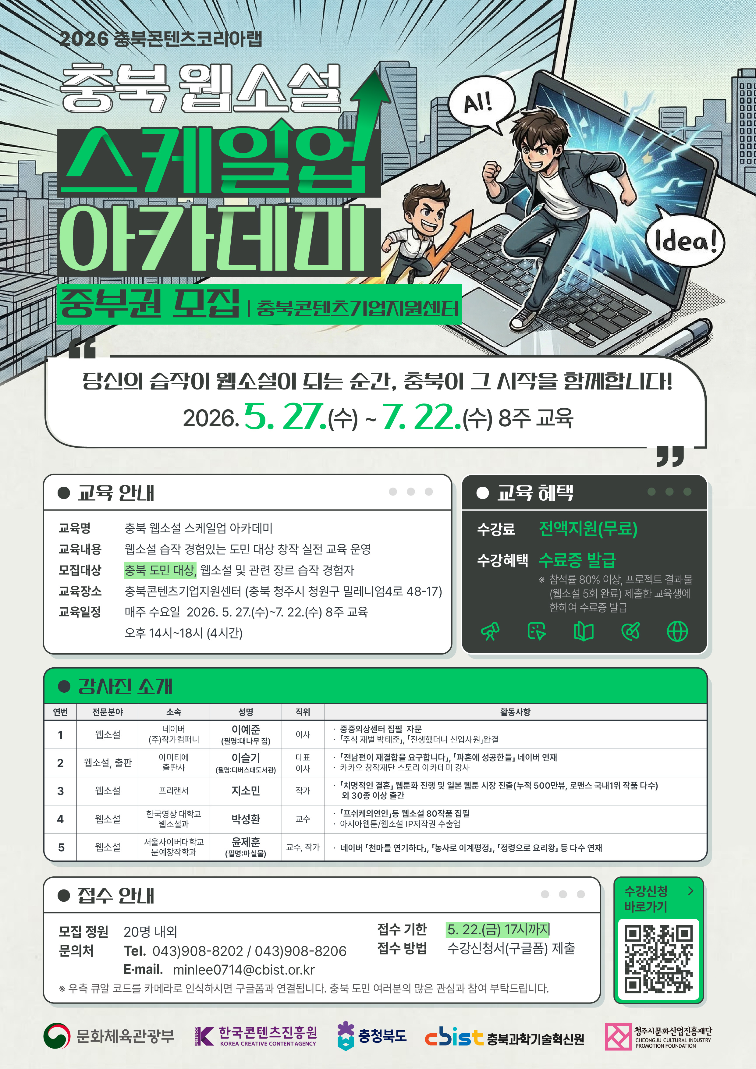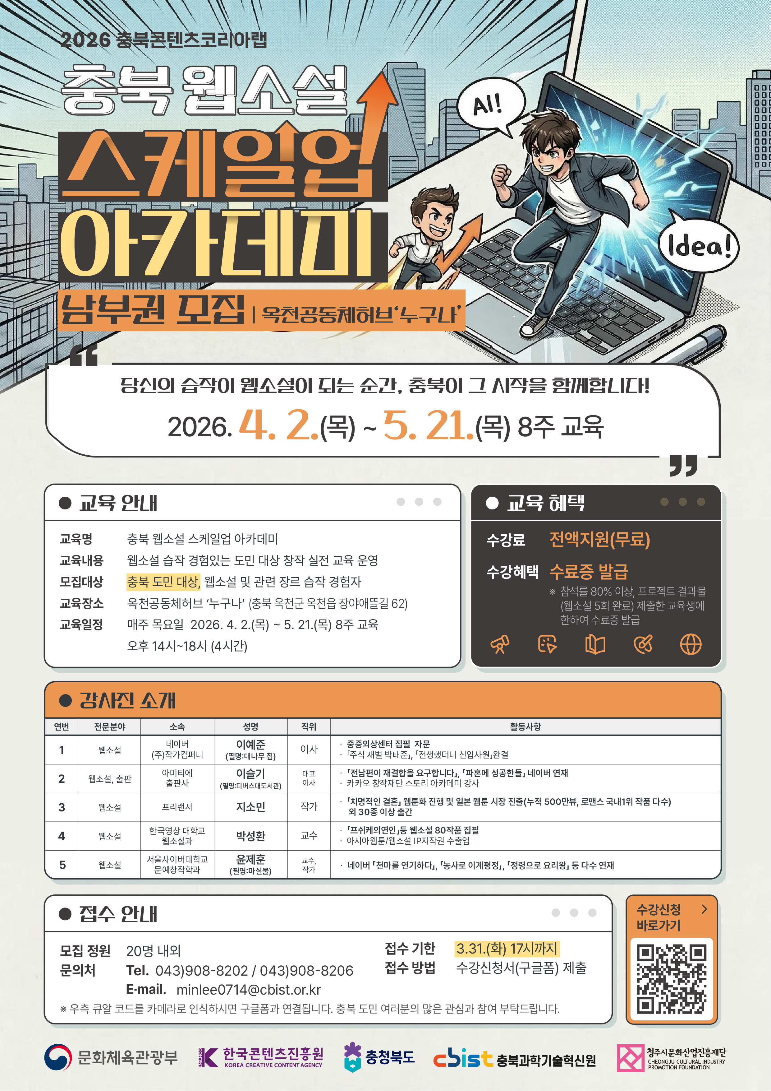 충북과학기술혁신원(충북콘텐츠코리아랩)에서는 스토리텔링에 소질있는 지역 인재 를 발굴해 웹소설 창작 역량을 강화하는 「충북 웹소설 스케일업 아카데미」수강생을 모집하오니 많은 관심과 참여 바랍니다. □교육개요 ❍ 교 육 명 : 충북 웹소설 스케일업 아카데미 ❍ 주요내용 : 웹소설 습작 경험있는 도민 대상 창작 실전 교육 운영 ❍ 주최/주관 : 한국콘텐츠진흥원, 충북과학기술혁신원(충북콘텐츠코리아랩) ❍ 모집대상 : 충북 도민으로 웹소설 및 관련 장르 습작 경험자 ❍ 수 강 료 : 전액지원(무료) ❍ 수강혜택 : 참석률 80% 이상, 프로젝트 결과물(웹소설 5회 완료) 제출한 교육생에 대해 수료증 발급 ❍ 모집정원 : 각 권역별 20명 내외 ❍ 모집기간 - 남부권: 2026. 3. 13.(금) ~ 2026. 3. 31.(화) - 북부권: 2026. 3. 13.(금) ~ 2026. 4. 03.(금) - 중부권: 2026. 4. 24.(금) ~ 2026. 5. 22.(금) ❍ 교육일정 : 각 권역별 매주 1회, 총 32시간 내외 - 남부권: 2026. 4. 2.(목) ~ 2026. 5. 21.(목) / 오후 14시~18시 - 북부권: 2026. 4. 7.(화) ~ 2026. 6. 02.(화) / 오후 14시~18시 - 중부권: 2026. 5. 27.(수) ~ 2026. 7. 22.(수) / 오후 14시~18시 ❍ 교육장소 - 남부권: (옥천) 옥천공동체허브 ‘누구나’ (충북 옥천군 옥천읍 장야애뜰길 62) - 북부권: (충주) 충주지식산업센터 (충북 충주시 주덕읍 화개4길 14) - 중부권: (청주) 충북콘텐츠기업지원센터 (충북 청주시 청원구 밀레니엄4로 48-17) □ 접수방법: 공고문 내 QR코드를 통해 수강신청서 작성 ❍ 접수기한 : 3.13.(금) ~ 5. 22.(금) 17시까지 ❍ 접수서류 : 참가신청서 및 개인정보수집이용동의서 □ 기타 안내 및 문의 ❍ 문 의 : 충북과학기술혁신원 콘텐츠진흥본부 콘텐츠코리아랩 담당자 Tel_ 043)908-8202 / 043)908-8206 E-mail_ minlee0714@cbist.or.kr |