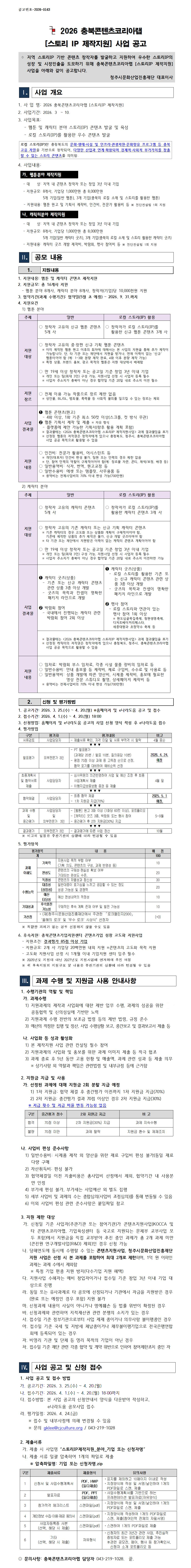 Home CB CKL 소식 CBCKL 소개 CBCKL 소식 프로그램 신청하기 홍보마당 커뮤니티 사이트 정보 로그인 마이페이지 공지사항 공지사항 보도자료 콘텐츠이슈 sns 공유하기 페이스북 공유하기 트위터 공유하기 블로그 공유하기 프린트하기 공지사항 공지사항 상세보기 - 제목, 담당부서, 담당자, 담당연락처, 내용, 첨부파일 정보 제공 제목 2026 충북콘텐츠코리아랩 [스토리 IP 제작지원] 웹툰 및 캐릭터 지원사업 공고 새글 핫이슈 작성자 충북콘텐츠코리아랩 사진 확대보기 파일 웹툰분야_신청서_2026 충북콘텐츠코리아랩 [스토리 IP 제작지원].hwp 캐릭터분야_신청서_2026 충북콘텐츠코리아랩 [스토리 IP 제작지원].hwp 콘텐츠 지원사업 관리규칙.pdf 공고문(최종)_2026 충북콘텐츠코리아랩 [스토리 IP 제작지원]_원페이퍼.png 목록