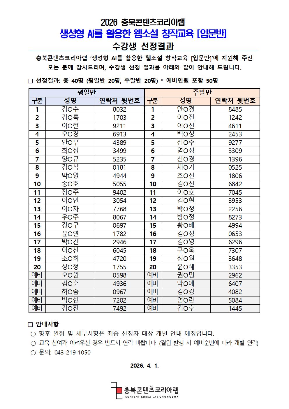 2026 충북콘텐츠코리아랩 생성형 AI를 활용한 웹소설 창작교육[입문반] 수강생 선정 결과 안내001.jpg