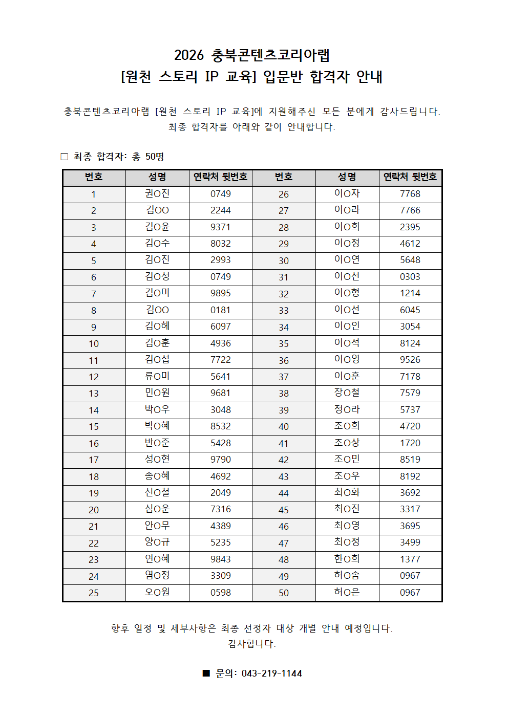 충북콘텐츠코리아랩 [원천 스토리 IP 교육]에 지원해주신 모든 분에게 감사드립니다. 최종 합격자를 위와 같이 안내합니다. 향후 일정 및 세부사항은 최종 선정자 대상 개별 안내 예정입니다. 감사합니다. ■ 문의: 043-219-1144 |