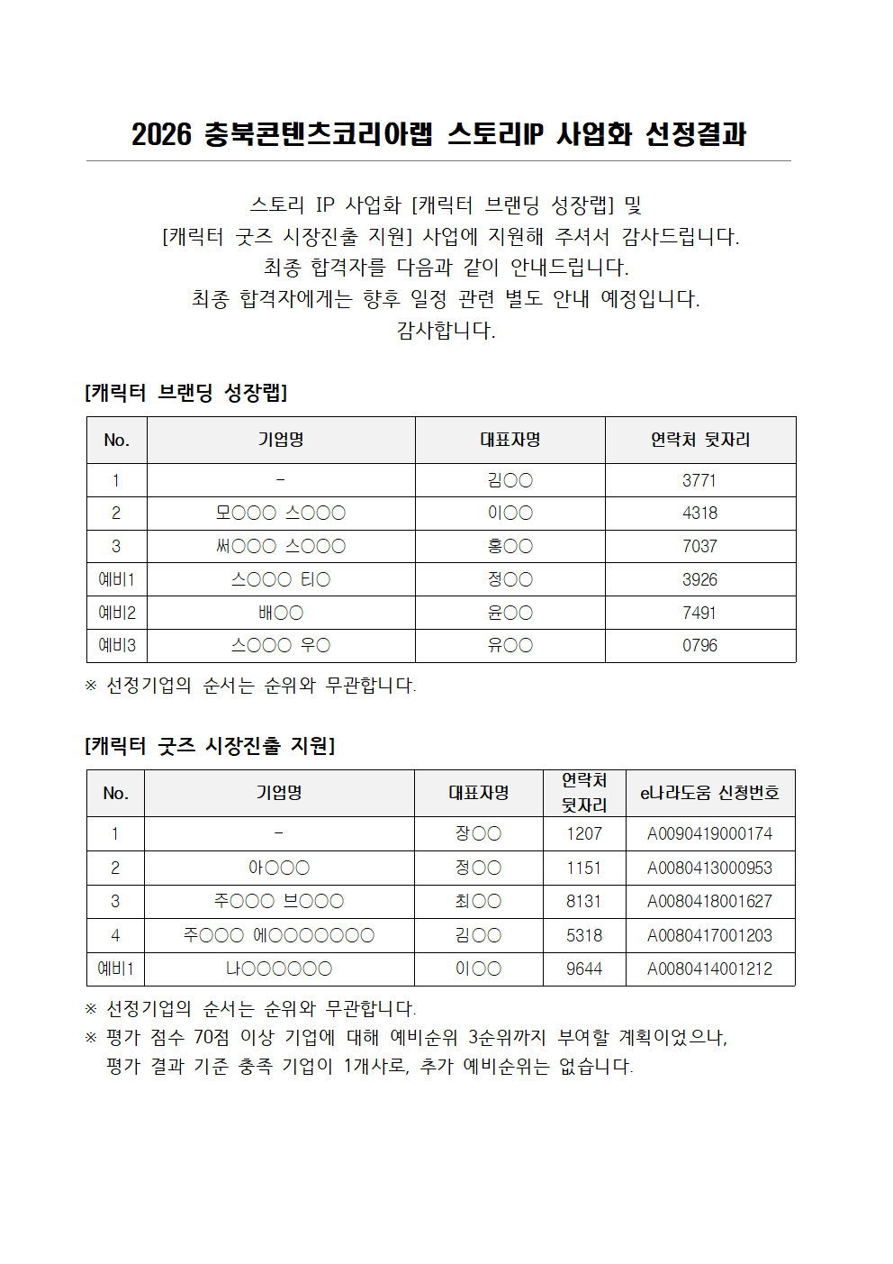 Home CB CKL 소식 CBCKL 소개 CBCKL 소식 프로그램 신청하기 홍보마당 커뮤니티 사이트 정보 로그인 마이페이지 공지사항 공지사항 보도자료 콘텐츠이슈 sns 공유하기 페이스북 공유하기 트위터 공유하기 블로그 공유하기 프린트하기 공지사항 공지사항 상세보기 - 제목, 담당부서, 담당자, 담당연락처, 내용, 첨부파일 정보 제공 제목 2026 충북콘텐츠코리아랩 [스토리 IP 사업화] 선정 결과 안내 새글 핫이슈 작성자 충북콘텐츠코리아랩 사진 확대보기 파일 2026 스토리IP 사업화_합격자 공지_최종001.png 목록
