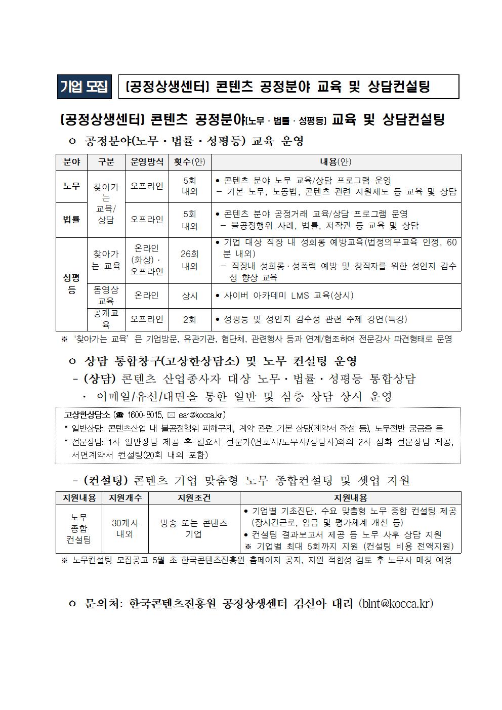 Home CB CKL 소식 CBCKL 소개 CBCKL 소식 프로그램 신청하기 홍보마당 커뮤니티 사이트 정보 로그인 마이페이지 공지사항 공지사항 보도자료 콘텐츠이슈 sns 공유하기 페이스북 공유하기 트위터 공유하기 블로그 공유하기 프린트하기 공지사항 공지사항 상세보기 - 제목, 담당부서, 담당자, 담당연락처, 내용, 첨부파일 정보 제공 제목 [한국콘텐츠진흥원] (공정상생센터) 콘텐츠 공정분야(노무·법률·성평등) 교육 및 상담컨설팅 새글 핫이슈 작성자 충북콘텐츠코리아랩 사진 확대보기 파일 (공정상생센터) 콘텐츠 공정분야(노무·법률·성평등) 교육 및 상담컨설팅.jpg 목록 이전글 2026 충북콘텐츠코리아랩 [스토리 IP 제작지원] 선정 결과 안내 다음글 [한국콘텐츠진흥원] (수출전략팀) WelCon 콘텐츠 비즈니스 상담 서비스