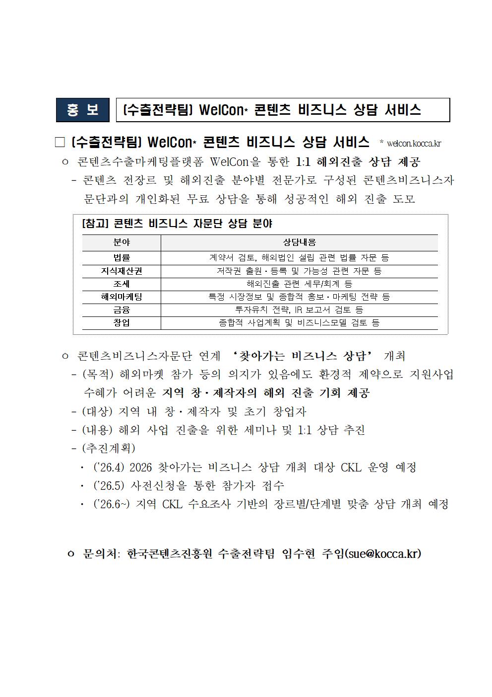 Home CB CKL 소식 CBCKL 소개 CBCKL 소식 프로그램 신청하기 홍보마당 커뮤니티 사이트 정보 로그인 마이페이지 공지사항 공지사항 보도자료 콘텐츠이슈 sns 공유하기 페이스북 공유하기 트위터 공유하기 블로그 공유하기 프린트하기 공지사항 공지사항 상세보기 - 제목, 담당부서, 담당자, 담당연락처, 내용, 첨부파일 정보 제공 제목 [한국콘텐츠진흥원] (수출전략팀) WelCon 콘텐츠 비즈니스 상담 서비스 새글 핫이슈 작성자 충북콘텐츠코리아랩 사진 확대보기 파일 (수출전략팀) WelCon 콘텐츠 비즈니스 상담 서비스.jpg 목록 이전글 [한국콘텐츠진흥원] (공정상생센터) 콘텐츠 공정분야(노무·법률·성평등) 교육 및 상담컨설팅 다음글 2026 충북콘텐츠코리아랩 [스토리 IP 제작지원] 사업 웹툰 분야 추가 모집 공고